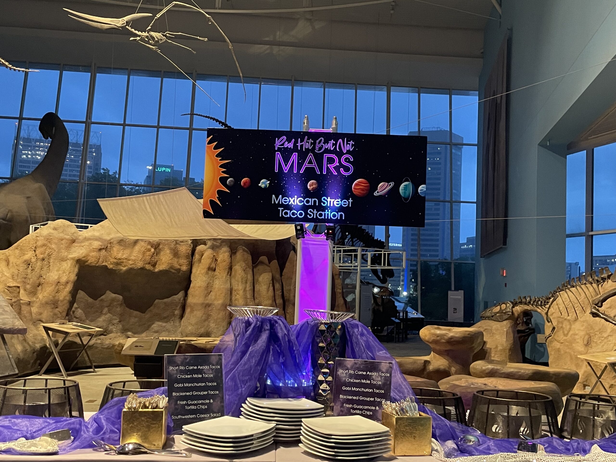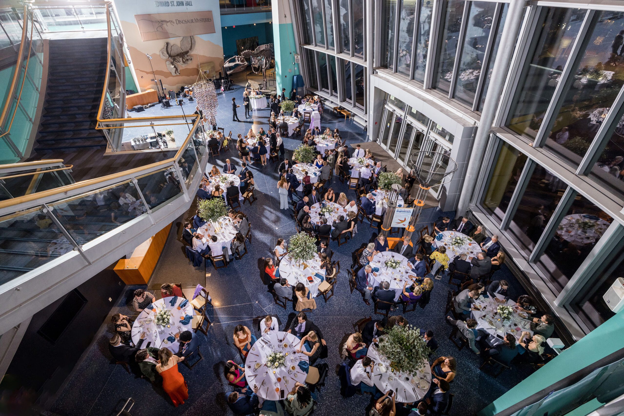Imagine your guests sipping cocktails at the edge of the waterfront and enjoying a gourmet dinner as dinosaurs loom overhead.